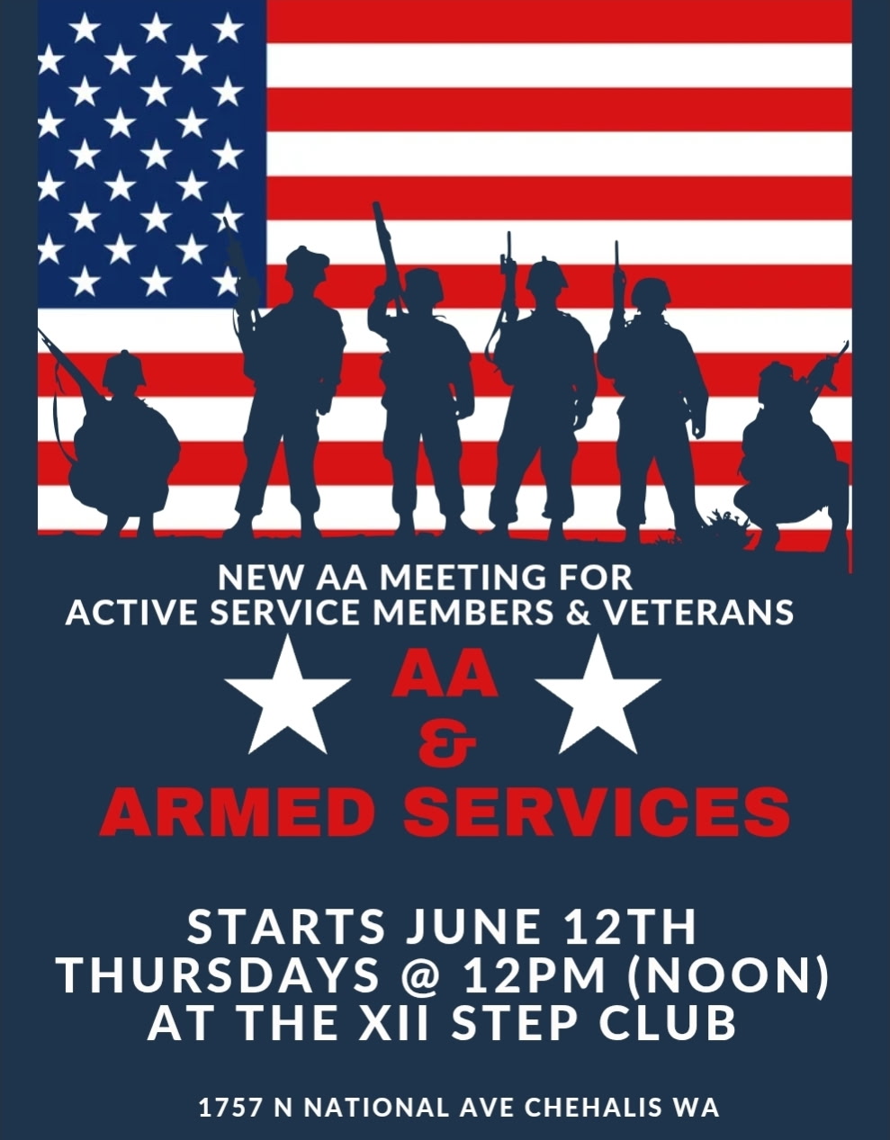 NEW MEETING AA & Armed SERVICES Thursdays 2pm at the XII Club
