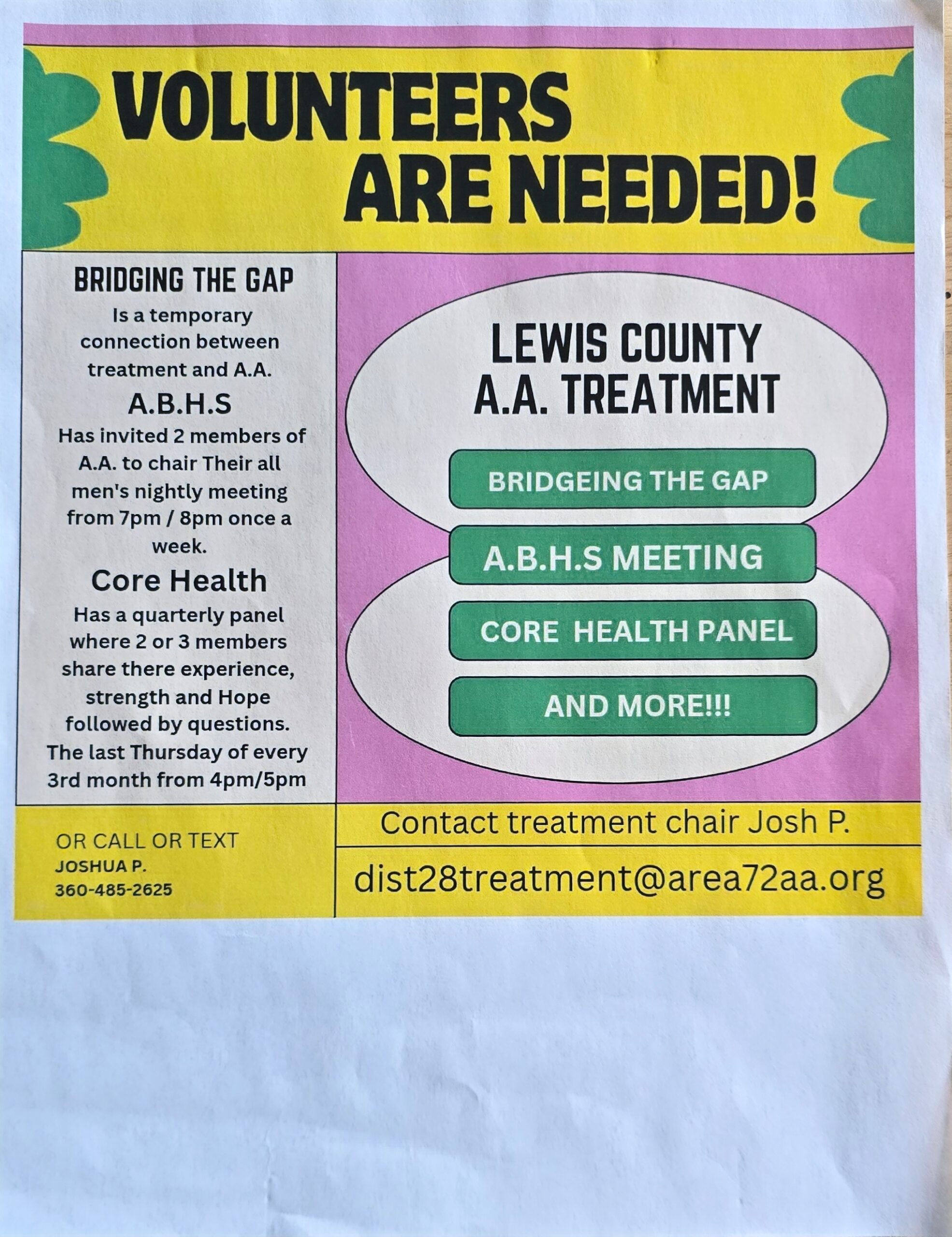 Email Josh at district28treament@area72aa.org oe call 360-485-2625