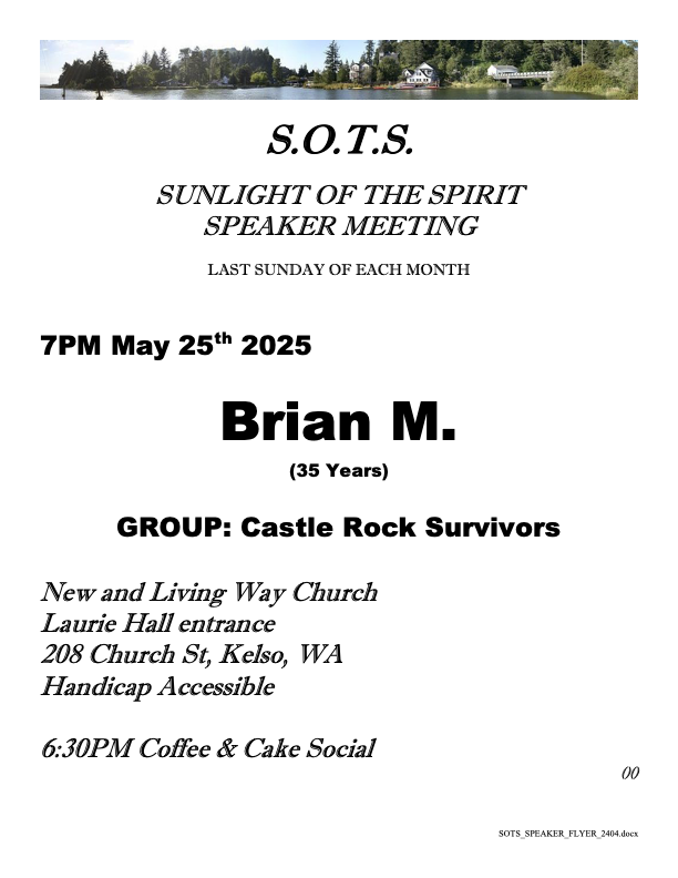 7:00 pm - 9:00 pm Sunlight of the Spirit Speaker Meeting May 25 @ 7:00 pm - 9:00 pm Sunlight of the Spirit Speaker Meeting Brian M. (35 years) Castle Rock Survivors
