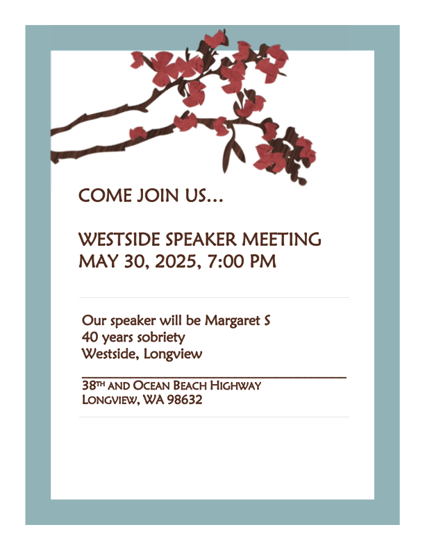 7:00 pm - 9:00 pm Westside Speaker Meeting May 30 @ 7:00 pm - 9:00 pm Westside Speaker Meeting Margaret S. (40 Years)