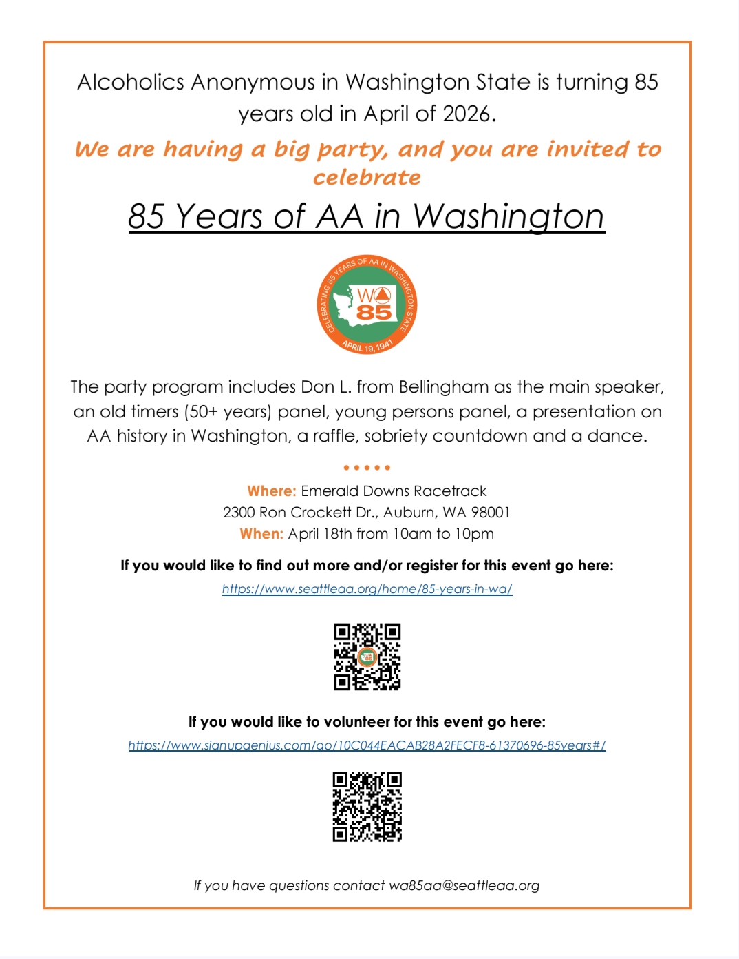 10:00 am - 10:00 pm 85 Years of AA in Washington April 18 @ 10:00 am - 10:00 pm 85 Years of AA in Washington